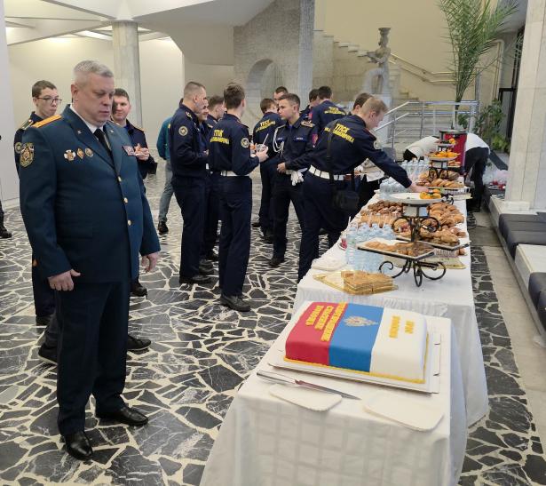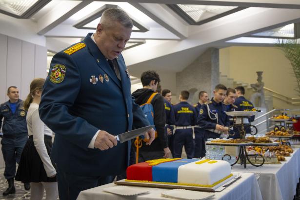 Перед началом торжественной церемонии начальник Управления по Зеленоградскому АО ГУ МЧС России по г. Москве Сергей Мусаелян разрезал тематический торт, после чего гости проследовали в празднично оформленный зрительный зал.
